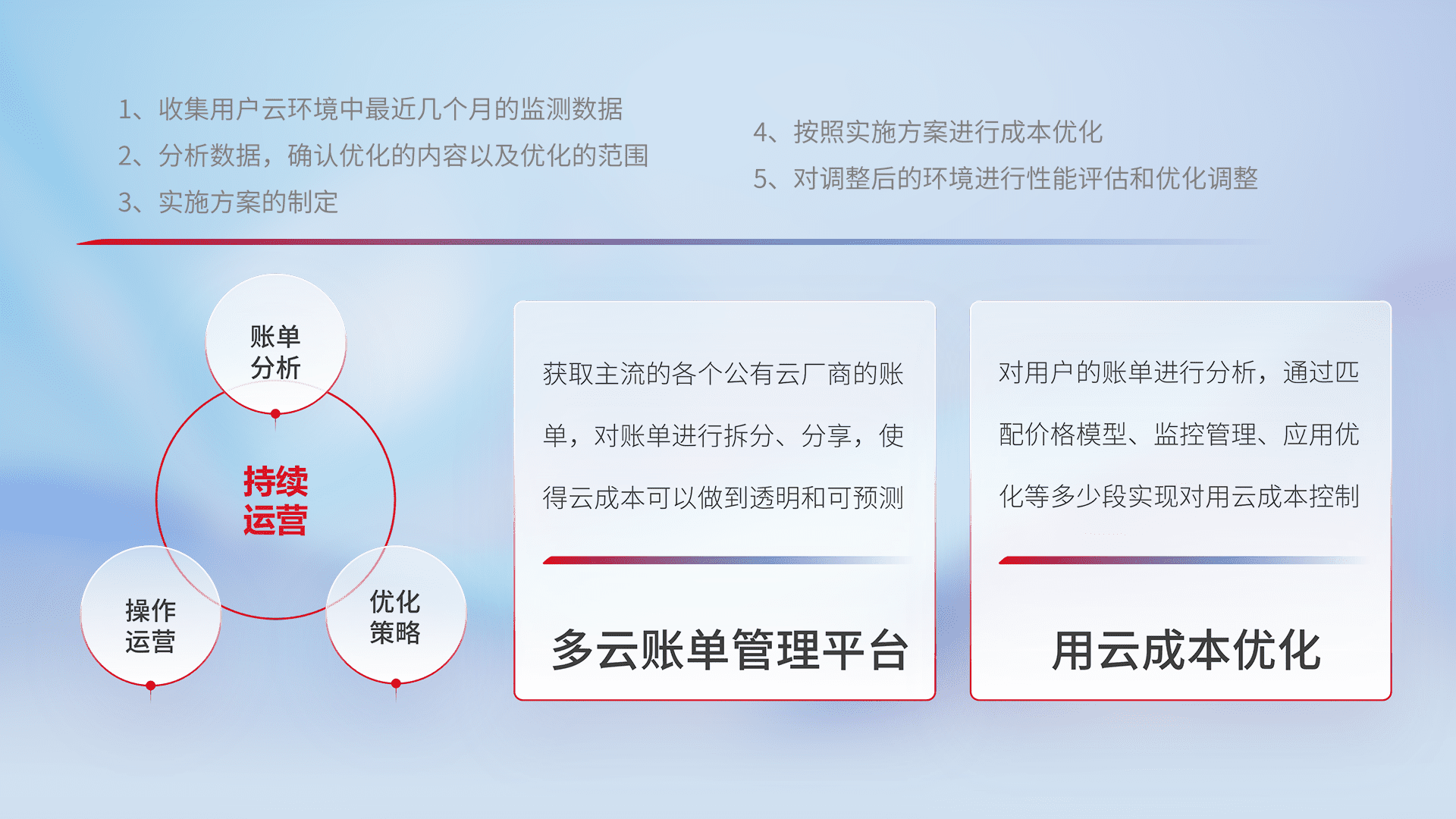 通过多云纳管,,,,以统一的资源数据模型把客户的云资源进行抽象和封装,,,,进而实现对多云资源的统一操作,,保障云资源管理的可靠性、、、、稳定性与可用性。。。量身定制化运维内容,,,配置、、、、开发运维、、、补丁管理、、备份、、监控、、、、认证和访问管理、、、审计和日常巡检等,,保障在用云过程中的可靠度,,,,稳定度以及高可用率。。