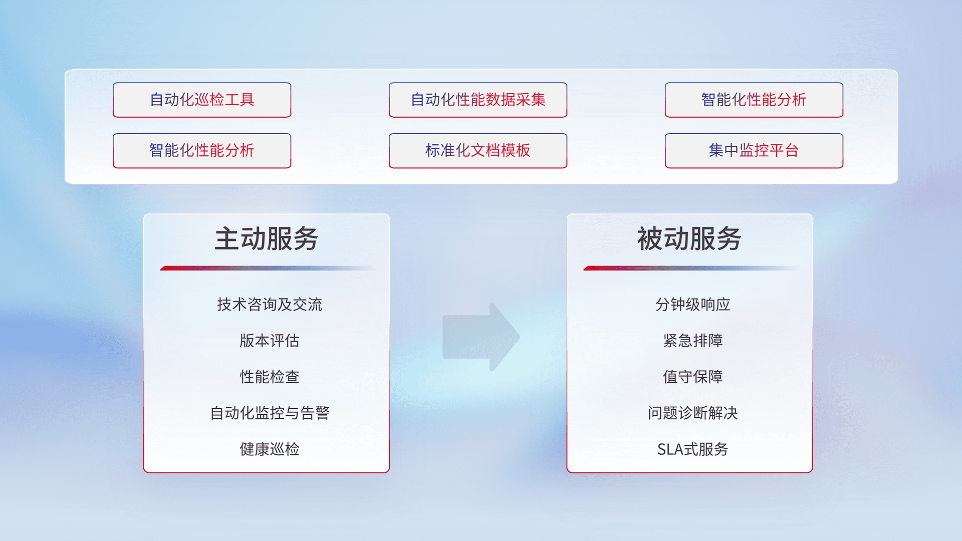 智能化工具和标准化文档,,,,保障服务质量,,提供主动服务(包含技术咨询、、、、版本评估、、性能检查、、、自动化监控与告警、、健康巡检)和被动服务包含(分钟级响应、、紧急排障、、、、值守保障、、、问题诊断解决、、、SLA服务)。。